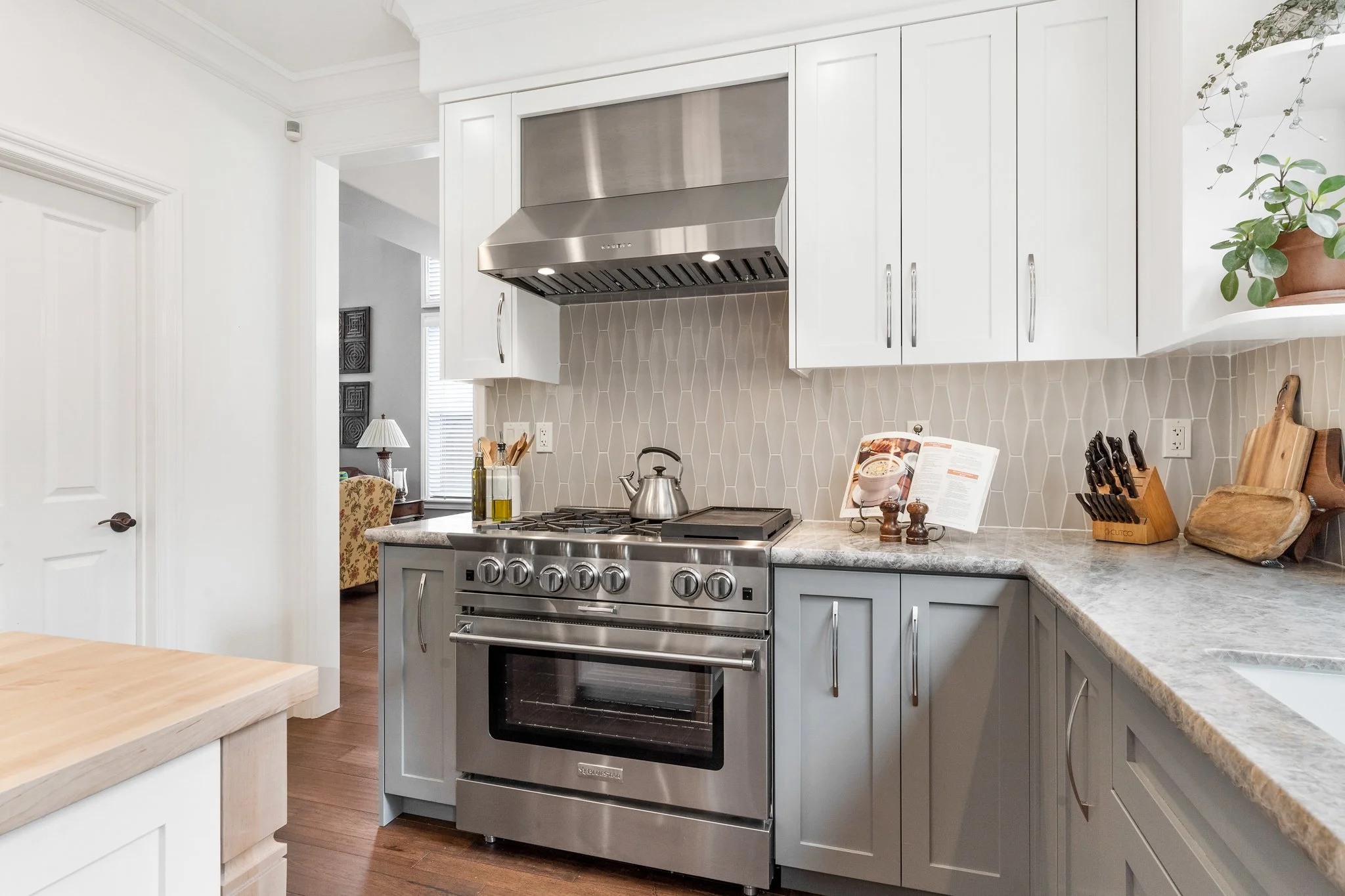 The new gas range dictated the layout of the new kitchen while height considerations determined how best to design storage. Base cabinets equipped with cabinet inserts like plate and pot drawers, tray pullouts, utensil pullouts, a corner susan, etc provide primary storage. Since the homeowner preferred to keep her mixer on top of the counter, cabinetry was clustered around this area making it easy and convenient to bake. The shaker perimeter cabinets’ white and grey split finish and white quartz countertop contrast nicely with the white painted island made to look like a piece of furniture and topped with butcher block.